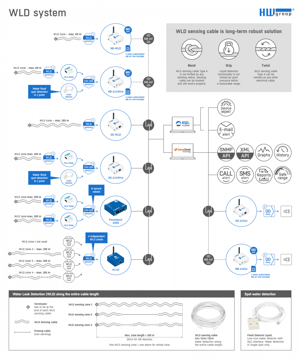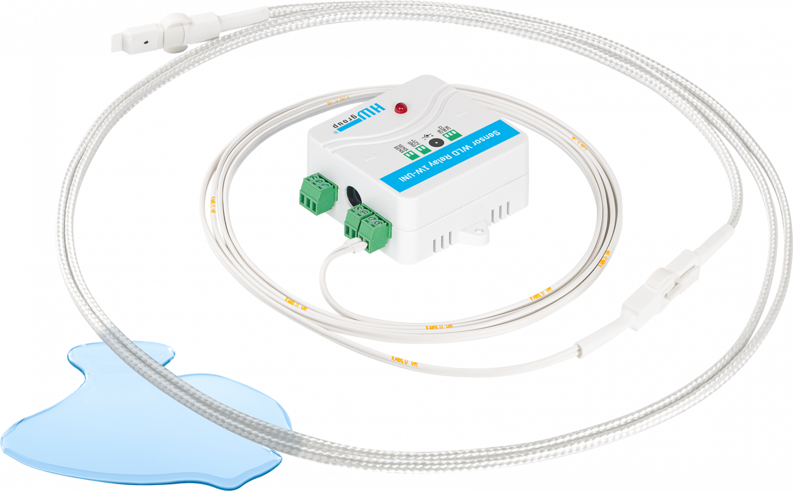 Το προϊόν HWg-WLD Relay ανιχνεύει διαρροή νερού οπουδήποτε κατά μήκος του συνδεδεμένου καλωδίου ανίχνευσης (2 + 2m).