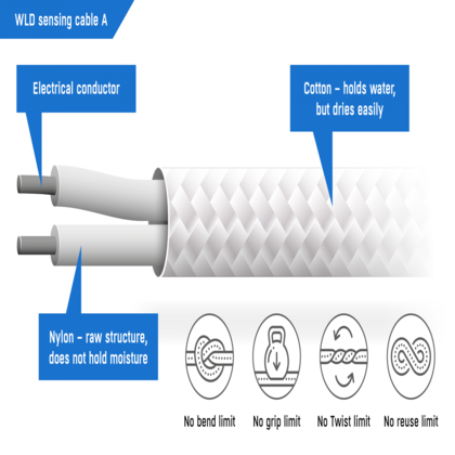 Το καλώδιο ανίχνευσης WLD τύπου Α είναι ένας αισθητήρας για την ανίχνευση της παρουσίας οποιουδήποτε αγώγιμου υγρού. Το υγρό ανιχνεύεται σε όλο το μήκος του καλωδίου ανίχνευσης WLD, πράγμα που σημαίνει ότι η εκτεταμένη περιοχή παρακολουθείται ταυτόχρονα. Το καλώδιο μπορεί να δρομολογηθεί κάτω από τα δάπεδα σε κέντρα δεδομένων ή κατά μήκος των τοίχων ή να τυλιχτεί γύρω από τους σωλήνες. Ακόμη και ο μικρότερος όγκος αγώγιμου υγρού (νερό, αιθυλενογλυκόλη...) μπορεί να ενεργοποιήσει τον συναγερμό. Το καλώδιο ανίχνευσης είναι το βασικό συστατικό του συστήματος WLD, το καλώδιο χρειάζεται συσκευή WLD ή ρελέ WLD για να λειτουργήσει σωστά.